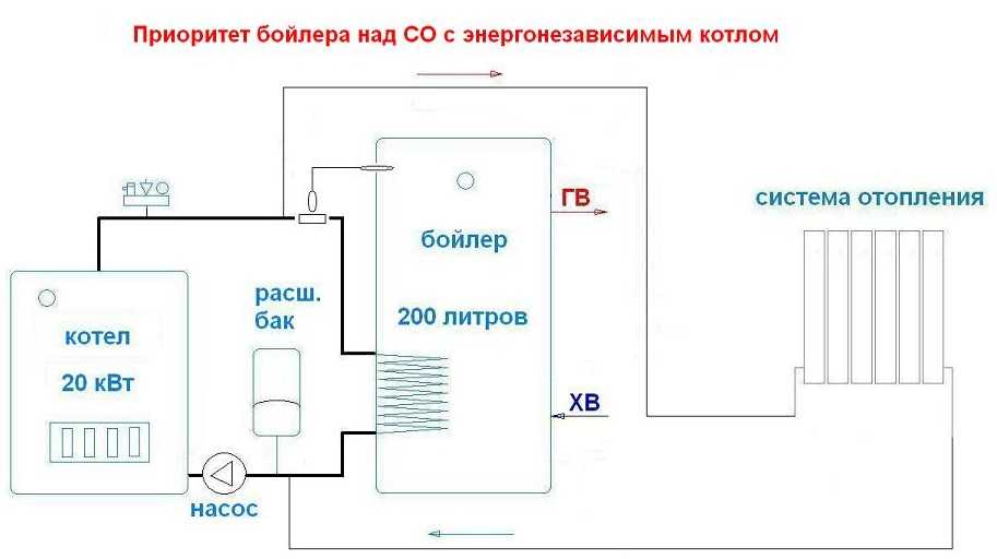 Этот способ обвязки пригодится тем, кто использует бойлер в постоянном режиме 2: Вариант с двумя циркуляционными насосами Если бойлер применяют редко например, сезонно или по выходным или появилась необходимость в воде, температура которой ниже, чем в системе обогрева, применяют схему с двумя циркуляционными насосами. Работает отопительная система квартиры или дома, и как бы вскользь словно побочным эффектом нагревается вода в бойлере. Подключённый бойлер к отопительному оборудованию и электрическим тэнам Такой способ возможен только при наличии отдельного котлового оборудования, которое способно работать от природных отопительных источников в виде сжиженного газа, угля или дров круглый год. Контур горячего водоснабжения также имеет более высокий приоритет перед контуром отопления, однако он достигается лишь за счет настройки алгоритма включения. Выполнение обвязки требует предварительного проведения грамотных теплотехнических расчетов.