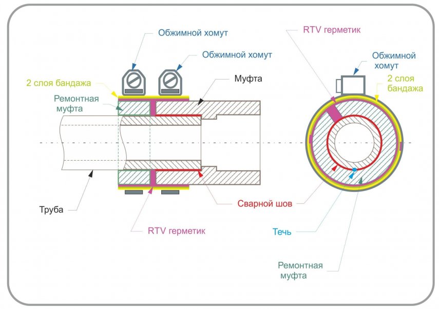 Важно, чтобы точка протекания, разрезы на ремонтной муфте и бандажах, находились в разных секторах. Через 12 часов соединение наберет необходимую прочность