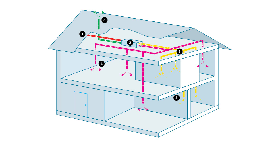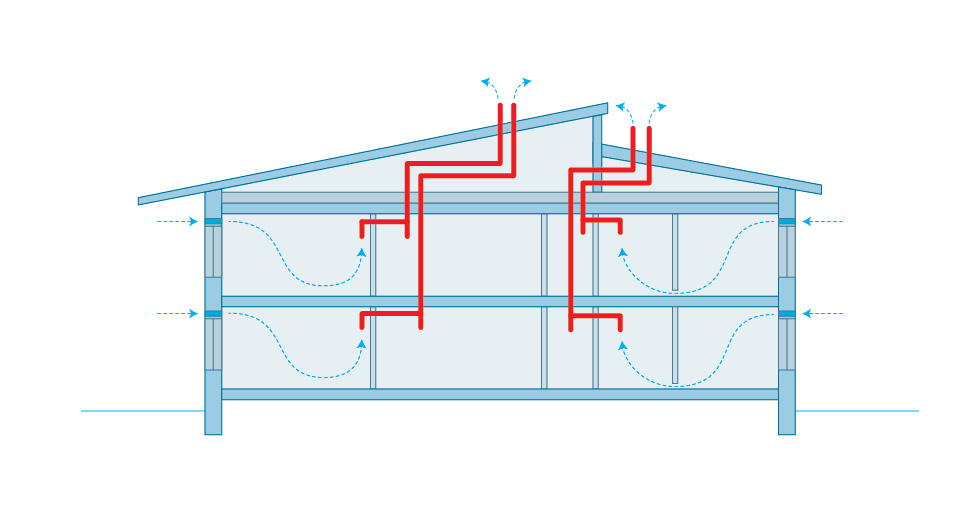 Для организации разводки используют пластиковые трубы. Дальше в работу вступает физика — более теплый комнатный воздух под давлением и за счет силы тяги вытягивается наружу, более холодный уличный воздух поступает в комнаты по специально-сделанным каналам, либо естественным образом (дверные проемы, открытые окна и т.д.).