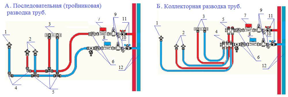 Коллекторная разводка обеспечивает напор на всем протяжении системы водоснабжения. Такой вариант идеально подходит для больших пространств. В некоторых случаях применяются одновременно два метода.