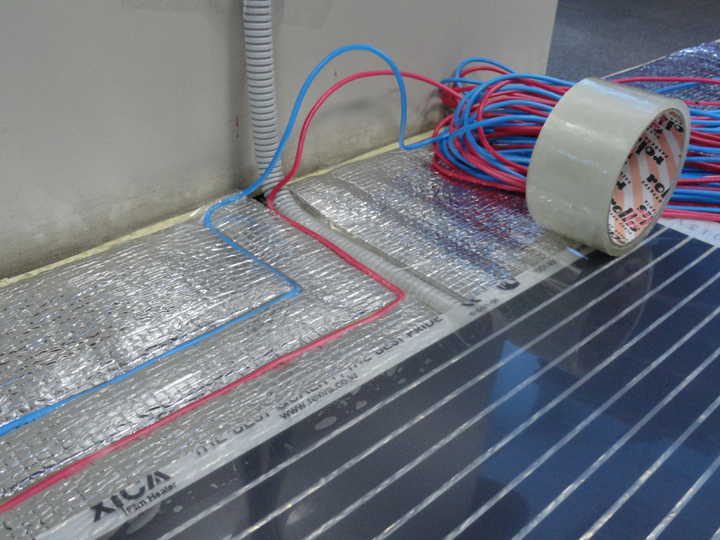 Чтобы избежать бессмысленного нагрева межэтажного перекрытия, под термопленку настилается специальный теплоотражающий материал с фольгированным слоем. При этом фольга должна оказаться сверху, а стыки полос проклеены алюминиевым скотчем.