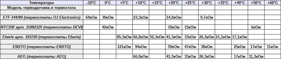 При нормальной температуре сопротивление терморезистора, в зависимости от модели термостата, составляет 6-15 кОм. При изменении температуры окружающей среды сопротивление терморезистора изменяется и таким образом микропроцессор получает информацию для прекращения или подачи питающего напряжения на нагревательный элемент (нагрузку).