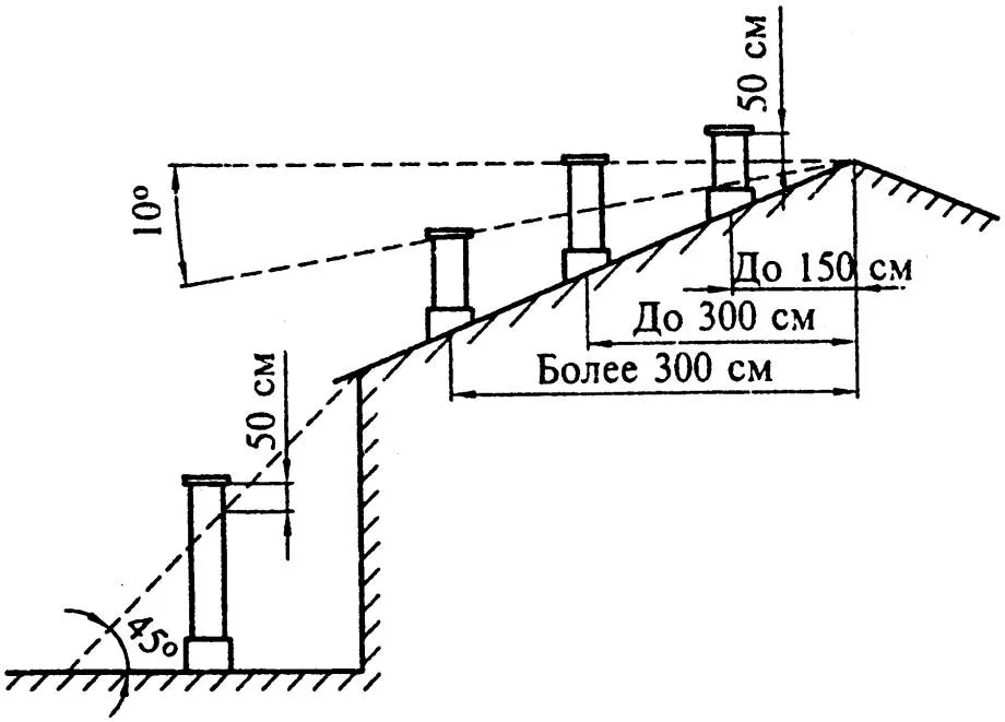 - Если же дымовая труба находится более чем в трех метрах от конька — то должна быть не ниже линии, проведенной от конька под углом 10 градусов к горизонту.