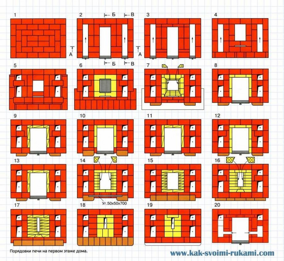 Постройка такой печи окажется вполне возможной для опытного мастера — если же опыта не хватает, рекомендуется обратиться для расчета чертежа к специалисту. При самостоятельной работе по готовой схеме требуется внимательно следовать рекомендациям, не изменяя порядовку выбранного проекта по своему усмотрению.