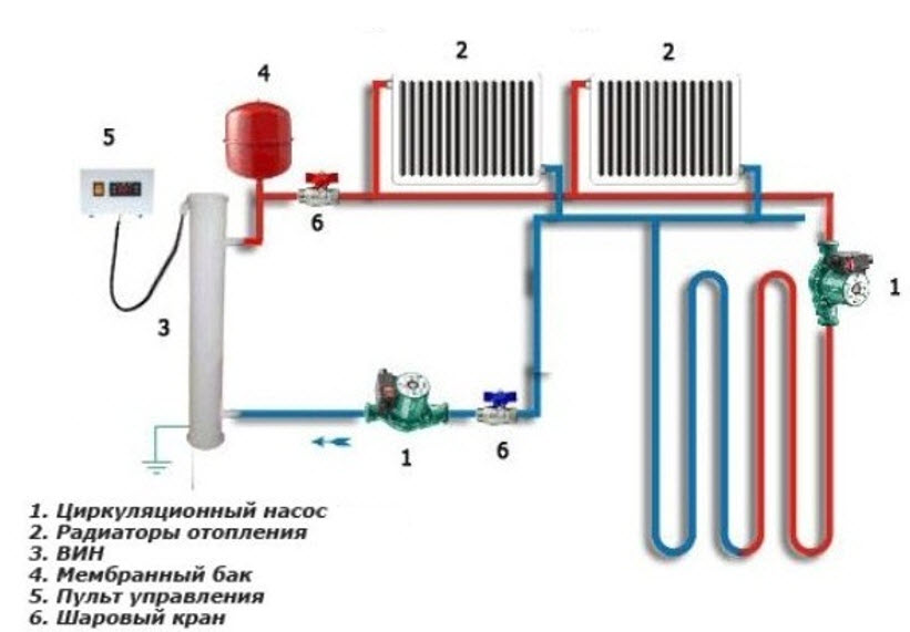 Температура теплоносителя не должна превышать 65оС. Потому циркуляционный насос устанавливается на обратной линии перед котлом, где течет уже остывшая вода