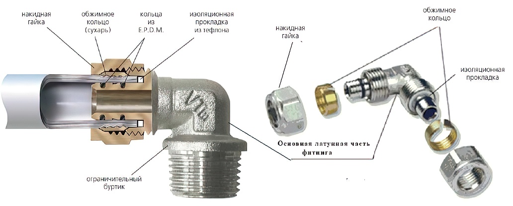 Компрессионные фитинги состоят из нескольких частей. Основа — литой корпус с резьбой. Также имеется обжимное кольцо, которое фиксирует кусок трубы на фитинге и накидная гайка, которая зажимает соединение. Важная деталь — уплотнительное кольца, которое обеспечивает герметичность.