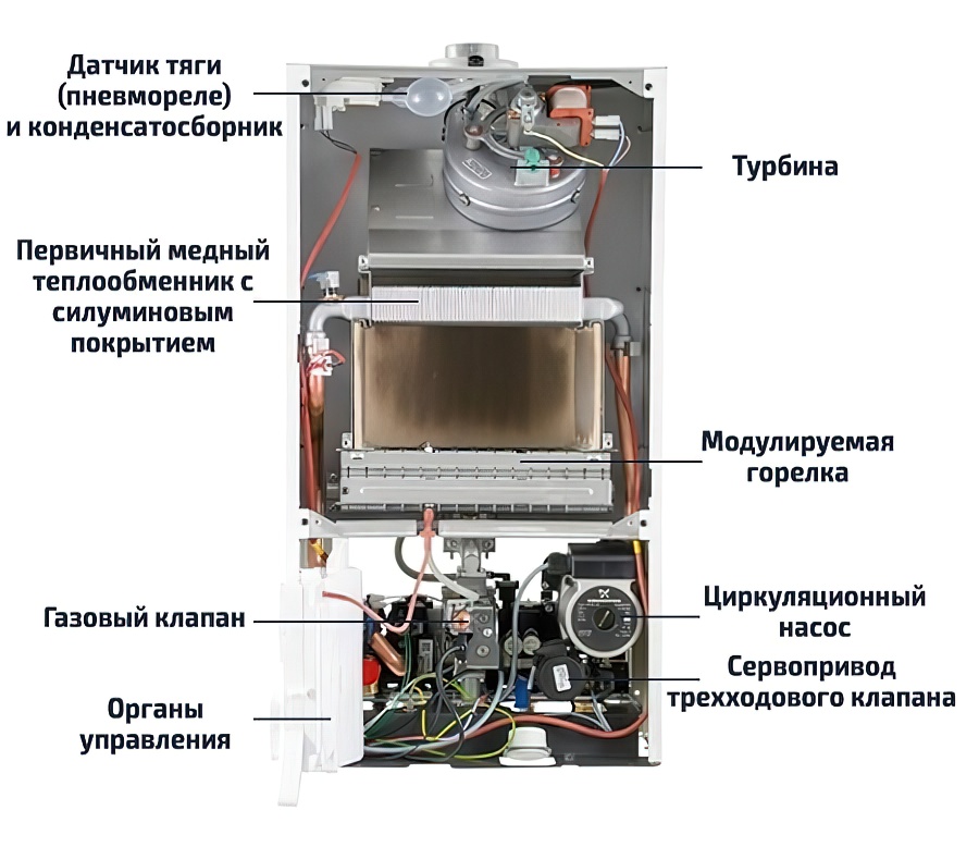 Отопительный прибор состоит из двух теплообменников (для отопления и горячей воды), регулировки температуры и горелки. Такое строение обеспечивает качественную и надежную работу оборудования и легкость в эксплуатации.
