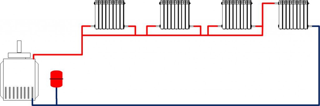 При однотрубной системе отопления все элементы подключены последовательно и расширительный бак нужно установить в самой верхней части конструкции. Из котла, нагретая вода идет вверх по стояку в расширительный бак, из него попадает в радиатор и немного остывает за счет отдачи тепла.