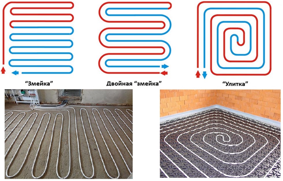 Варианты укладки труб: простые, угловые или двойные петли (змейки), спирали (улитки). Для узких коридоров и помещений неправильной формы используют укладку змейкой. Большие площади разбивают на сектора. Допускается комбинированная укладка: в краевой зоне труба выкладывается змейкой, в основной части — улиткой.