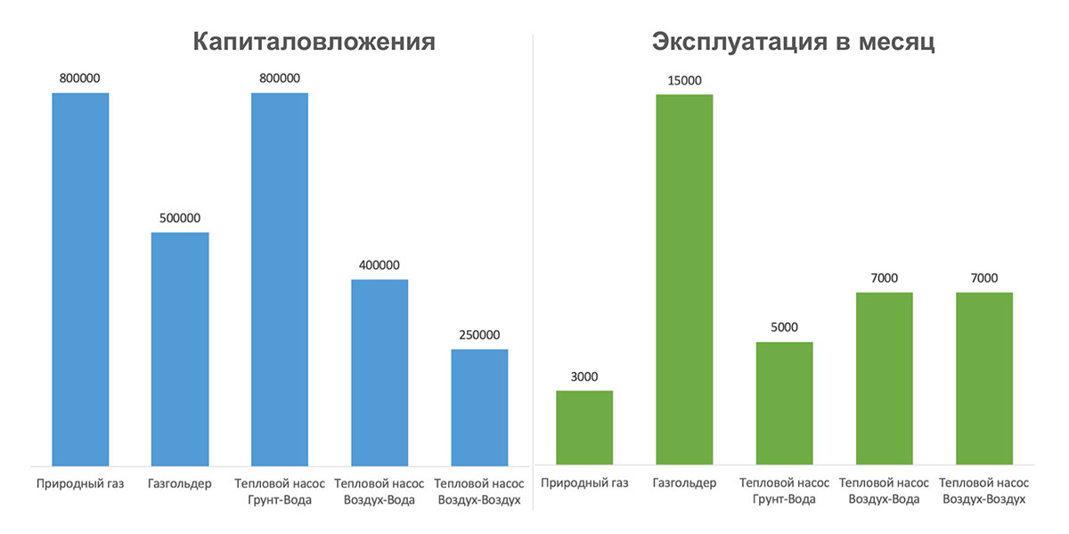 Сравним экономическую выгоду от использования теплового насоса с другими источниками тепловой энергии:
