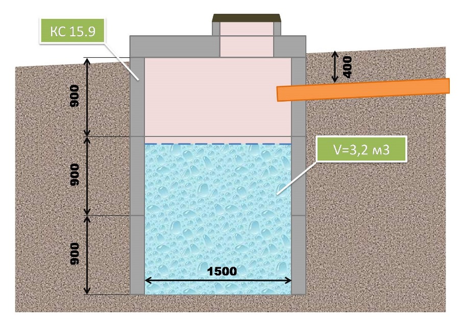 Для его обустройства использованы три железобетонных кольца марки КС-15-9, размерные параметры которого указаны на картинке: