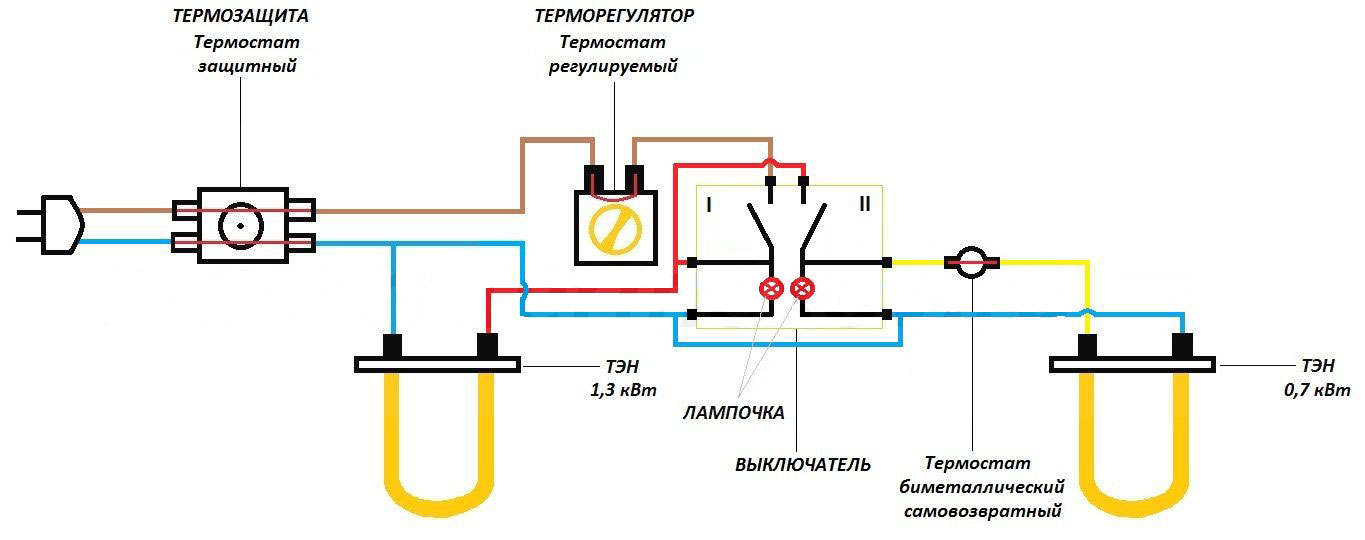 По внешнему виду терморегуляторы бойлеров могут сильно отличаться, но в большинстве случаев их принцип работы особо не меняется. Основным элементом является теплопроводящий стержень, который расширяясь при нагреве, приводит в действие группу контактов, они в свою очередь отключают от сети ТЭН. Когда стержень остывает, его длина постепенно уменьшается, а подпружиненные контакты смогут включить ТЭН обратно. И так по кругу. В случае аварийной ситуации в терморегуляторе предусмотрена аварийная защита. Она представляет собой биметаллическую круглую выпуклую пластину с отдельной группой контактов. Когда происходит перегрев, пластина изменяет свою форму и полностью отключает ТЭН. Если сработала такая защита, необходимо нажать на маленькую красную кнопку. Таким образом, мы вручную придадим исходную форму биметаллической пластине и включим контакты для питания ТЭНА.