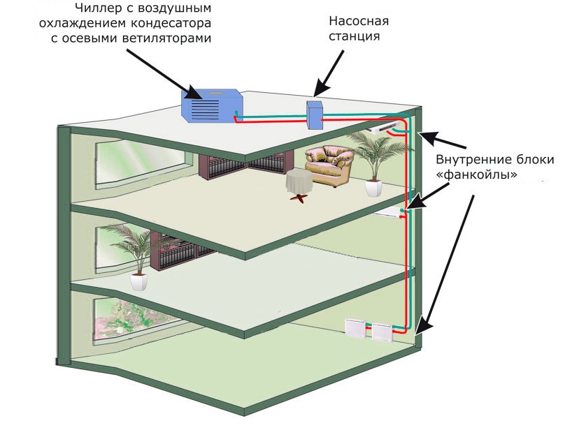 В данном случае такая система охлаждения работает для кондиционирования больших зданий, где между чиллером и фанкойлами находится теплотрасса, по которой циркулирует охлажденная жидкость. В качестве такой жидкости, как правило, выступает вода для жаркого климата или водный раствор C2H6O2 (этиленгликоль) для холодного и умеренного климата. Система чиллер-фанкойл между двумя основными агрегатами предусматривает разводку труб для движения жидкости и циркуляционный насос с автоматическим управлением. Охлажденная жидкость в трубопроводе находится под относительно низким давлением.