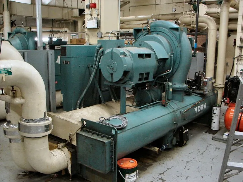 Компрессор. Он используется для создания разности давлений на линии «всаса» и подачи воды. Мощные чиллеры могут иметь до четырех охлаждающих контуров, каждый из которых оснащается одним-двумя компрессорами.