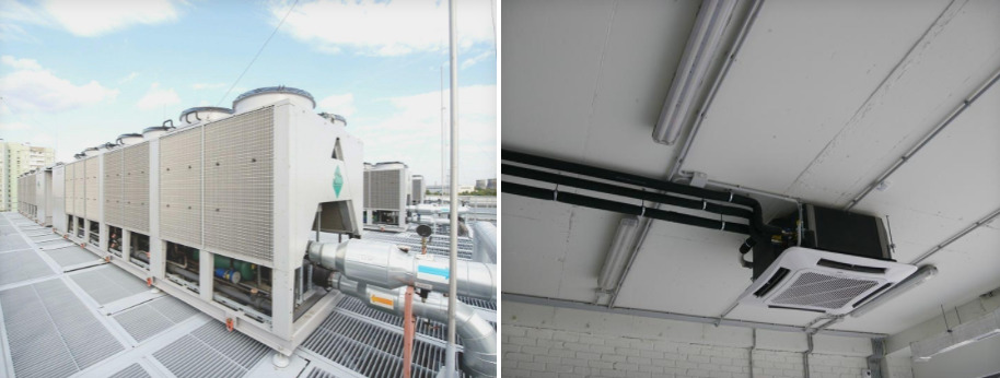 Система чиллер-фанкойл способна одновременно обеспечивать стабильную температуру сразу в нескольких объектах и этажах, поддерживая автономный режим для каждого из помещений. Это могут быть: