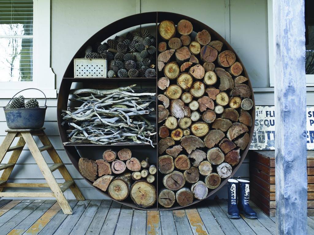 Отличной идеей для уличного хранения дров станут обычные бетонные кольца. Подход весьма нестандартный, а смотрится такой вариант очень стильно и оригинально на загородном участке. Для того, чтобы соорудить такую дровницу на даче, нужно приобрести уже готовые бетонные кольца. Без помощников в строительстве не обойтись, так как они имеют внушительный вес.