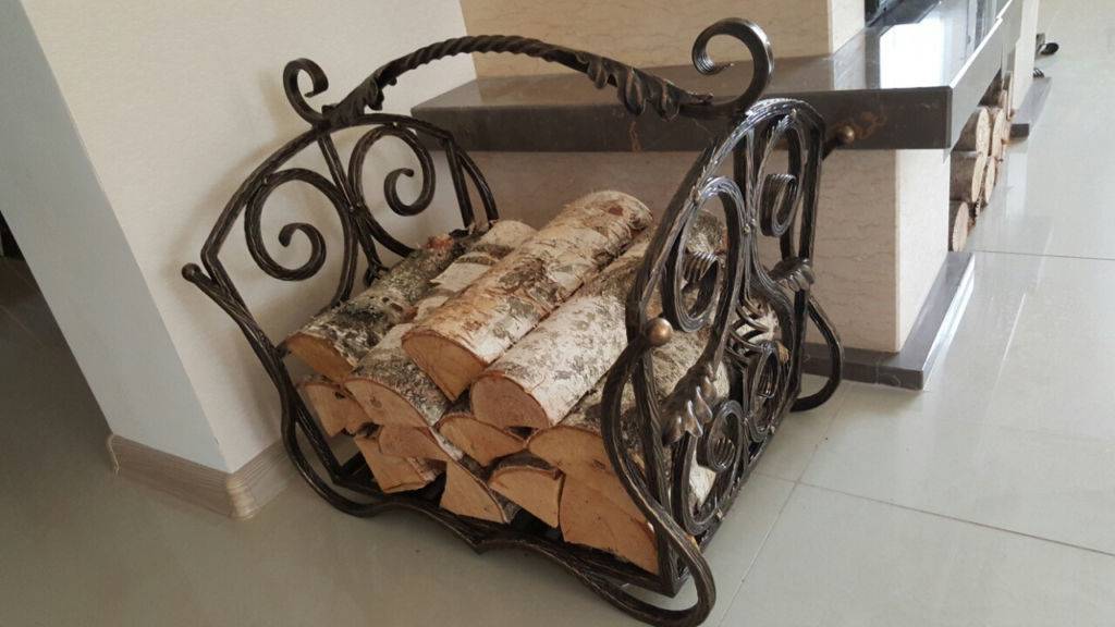 С кованым орнаментом Источник tutkamin.ru Камин и со вкусом подобранный к нему аксессуар создадут оригинальный ансамбль, дополняющий обстановку гостиной. Приобретать подставку для дров следует в специализированном магазине, предоставляющем гарантию качества на дровник для камина; купить в Москве подобный аксессуар можно по следующим ценам (указаны средние величины):