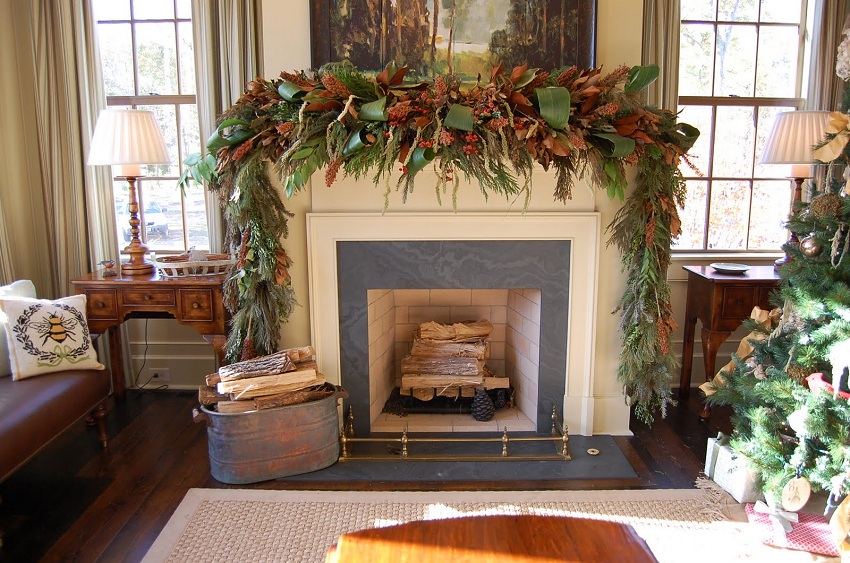 Пседокамин, декорированный фотографиями из журналов, нарезанных в виде кирпичиков, также смотрится интересно. При желании и наличии свободного времени, очаг из картона или фанеры оклеивают газетными трубочками, раскрашенными так, будто это настоящая лоза. Внутрь каминных конструкций помещают старинные сундуки и ретро-чемоданы, картины в рамах или зеркала с узорчатыми краями. Над самим предметом вешают гитару, телеэкран, резное деревянное панно, а стенку – разрисовывают либо оклеивают фотообоями.