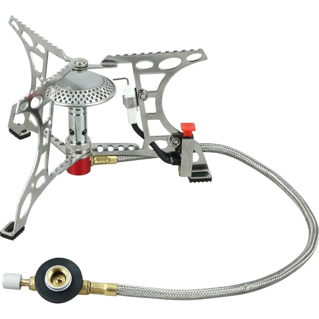 - Со шлангом. Конструкция представляет собой горелку, соединенную с небольшим баллоном для топлива гибкой трубой. Устройство прекрасно подходит для тяжелой массивной посуды. Устойчивость горелки обеспечивают крепкие ножки с широкой постановкой.