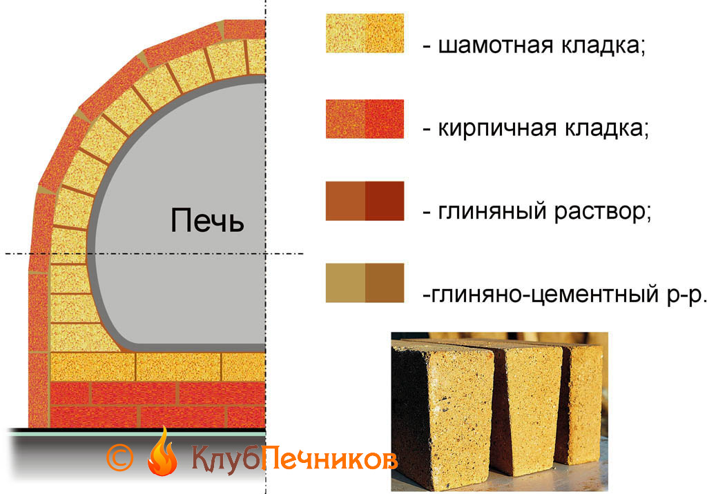 - Выкладывается подушка под печь рабочим кирпичом на глиняно-цементном р-ре, а по нему шамотным на глиняном печном (выделено тоном).