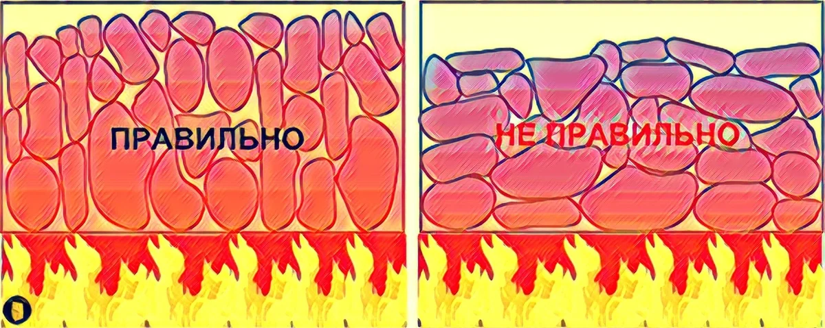 - Продолговатые камни не кладите плашмя. Лучше поставьте их торцом, более узкой стороной вниз. Правило обусловлено большей скоростью распространения тепловой энергии вдоль пластов, а не поперек их. Также причиной такого выбора является необходимость в свободном прохождении горячего воздуха между камнями. Торцевая кладка увеличивает количество зазоров между экземплярами.