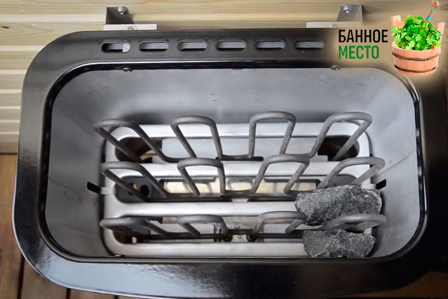 Банная электрическая каменка – это емкость, внутри которой расположены ТЭНы (электронагревательный прибор в виде металлической трубки). Они размещены на определенном промежутке друг от друга, что дает возможность укладывать камни между отдельными элементами.