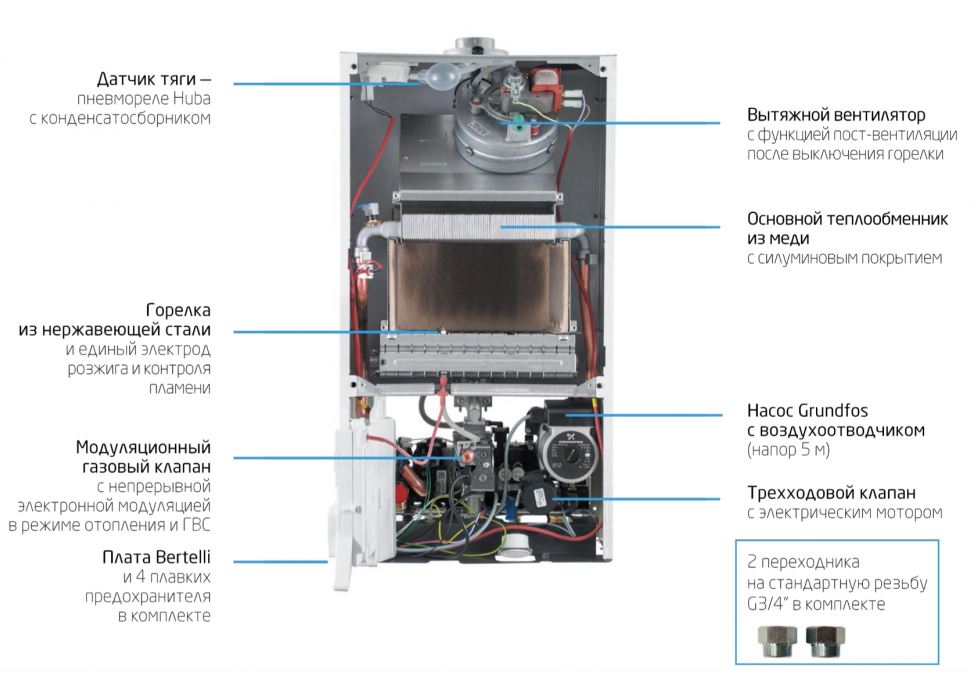 В газовом котле происходят следующие процессы: переключение потока горячей воды, нагрев воды, вывод продуктов сгорания и контроль безопасности.
