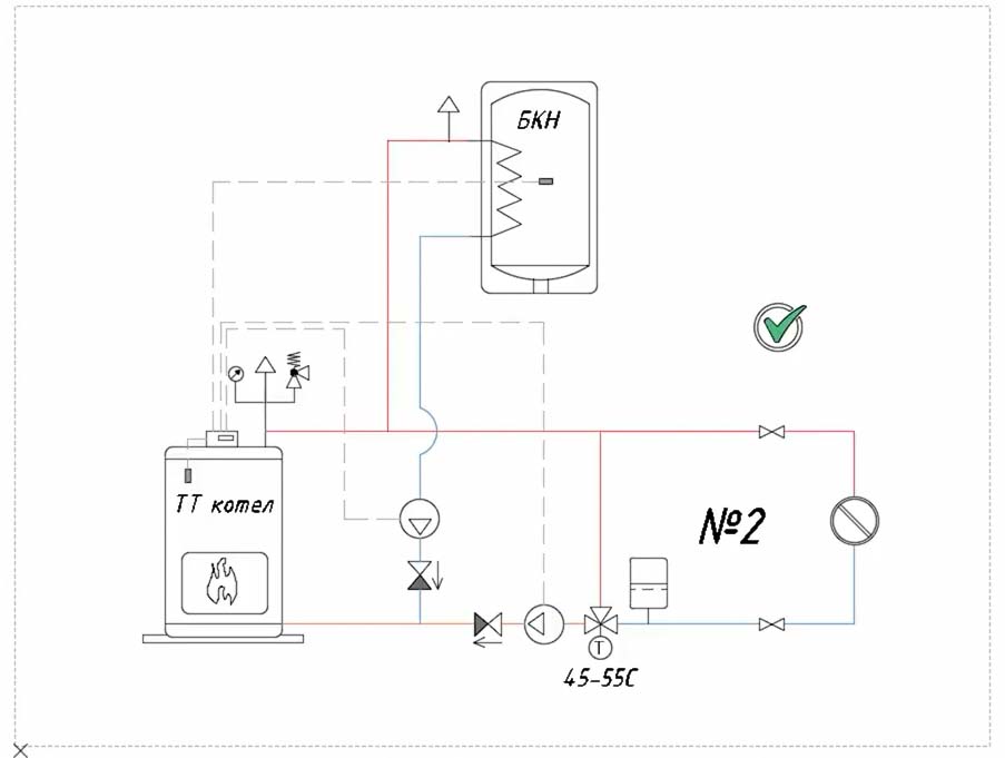 Эта схема подключения твердотопливного котла обладает рядом преимуществ. Первое — возможность организовать приоритет нагрева бойлера путем отключения насоса. В этом случае вся мощность котла направляется на нагрев бойлера, ускоряя его нагрев.