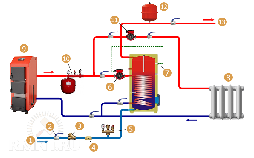 1 — подача холодной воды; 2 — запорная арматура; 3 — сетчатый фильтр; 4 — обратный клапан; 5 — группа безопасности; 6 — циркуляционный насос системы ГВС; 7 — термостат бойлера; 8 — радиатор; 9 — котел отопления; 10 — группа безопасности котла; 11 — циркуляционный насос системы отопления; 12 — расширительный бак системы ГВС; 13 — горячая вода к потребителям