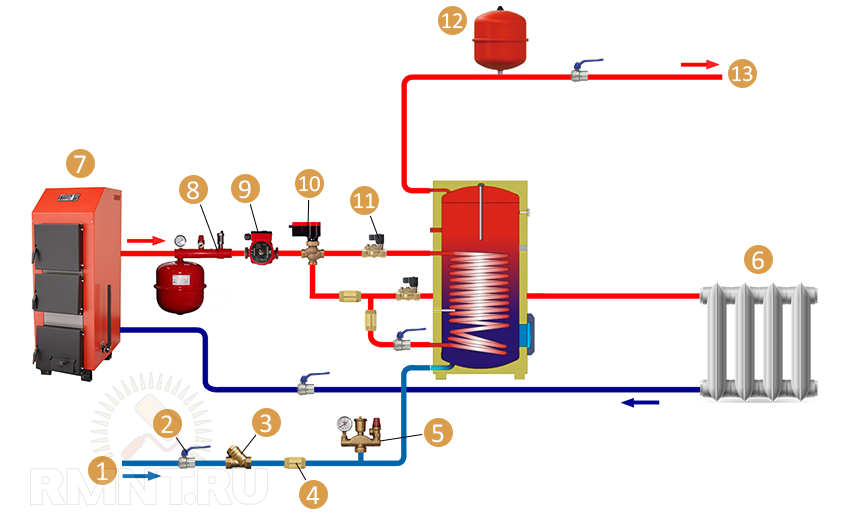 1 — подача холодной воды; 2 — запорная арматура; 3 — сетчатый фильтр; 4 — обратный клапан; 5 — группа безопасности; 6 — радиатор отопления; 7 — котел отопления; 8 — группа безопасности котла; 9 — циркуляционный насос; 10 — трехходовой кран; 11 — электромагнитный клапан; 12 — расширительный бак системы ГВС; 13 — горячая вода к потребителям