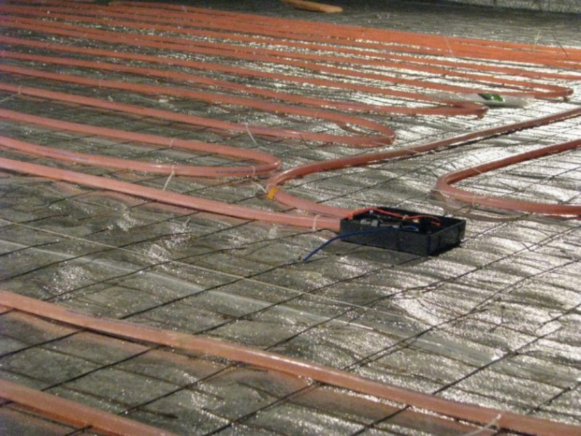Монтаж водяного контура — это могут быть трубы из меди, полиэтилена или термостойкого пластика. Укладка нагревательных элементов производится по запланированной схеме и с установленным шагом. Крепить трубы можно к армирующей сетке, которая укладывается на теплоизоляцию, пластиковыми хомутами, или фиксировать между пазов полистирольных плит.