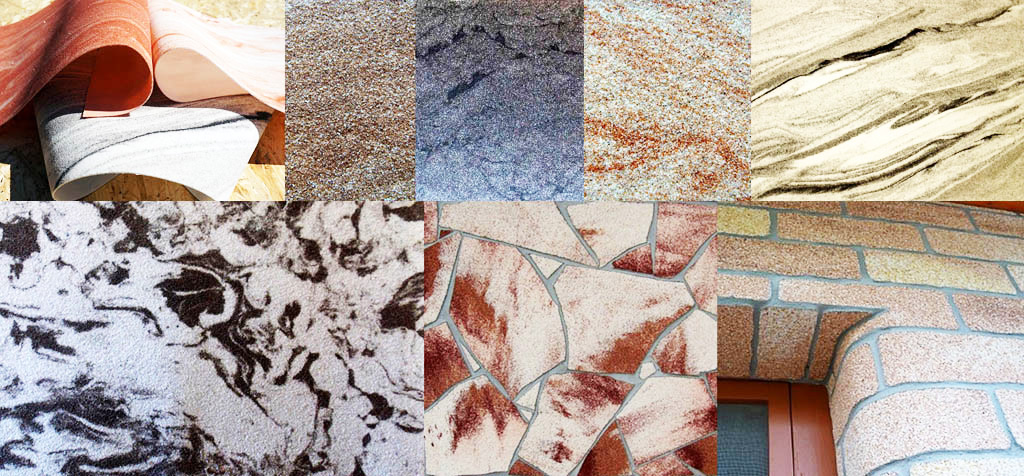 Гибкий камень режется ножницами по металлу; им можно обводить криволинейные поверхности (справа внизу на рис.). Недостаток данного материала – всегда шероховатая поверхность; получать полированный гибкий камень пока еще никто не научился. Монтировать гибкий камень на базовую поверхность можно разными способами, см., напр. след. сюжет: