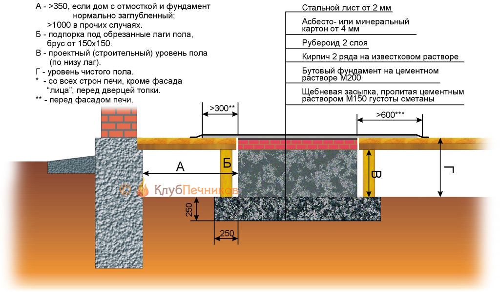 В идеале основа закладывается одновременно со строительством участка, при этом база дома и печи не должны быть связаны. Схема строения фундамента выглядит следующим образом: