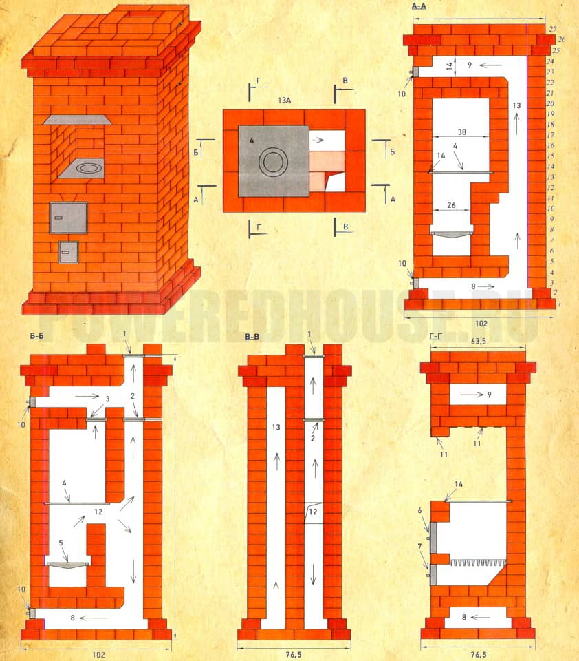 Если же вы обладаете элементарными навыками кладки кирпича и уже имели дело с монтажом печей, то наша подробная пошаговая инструкция позволит вам осилить этот процесс. Точно следуйте инструкции и возводите каждый ряд в соответствие с указанной схемой.