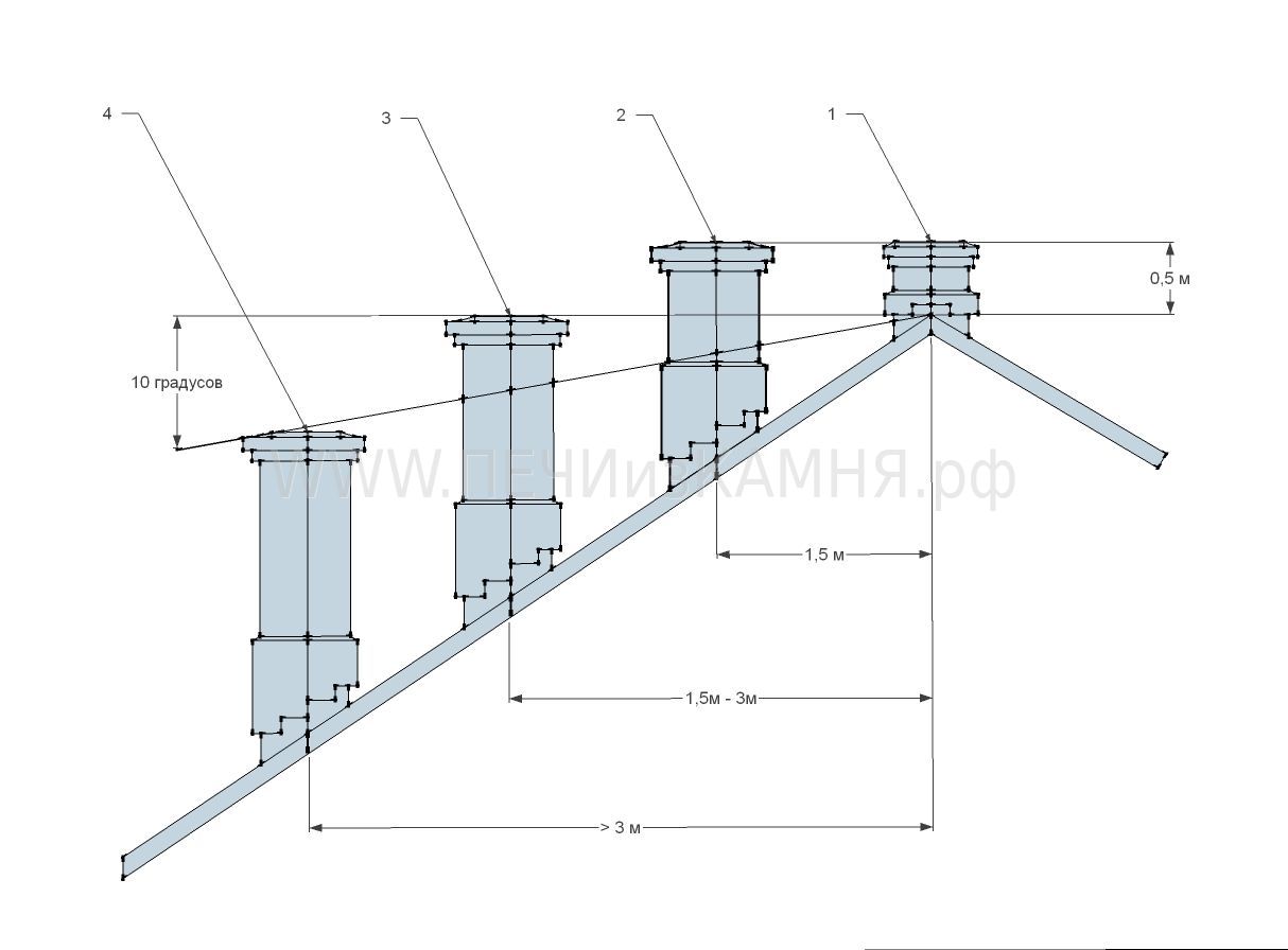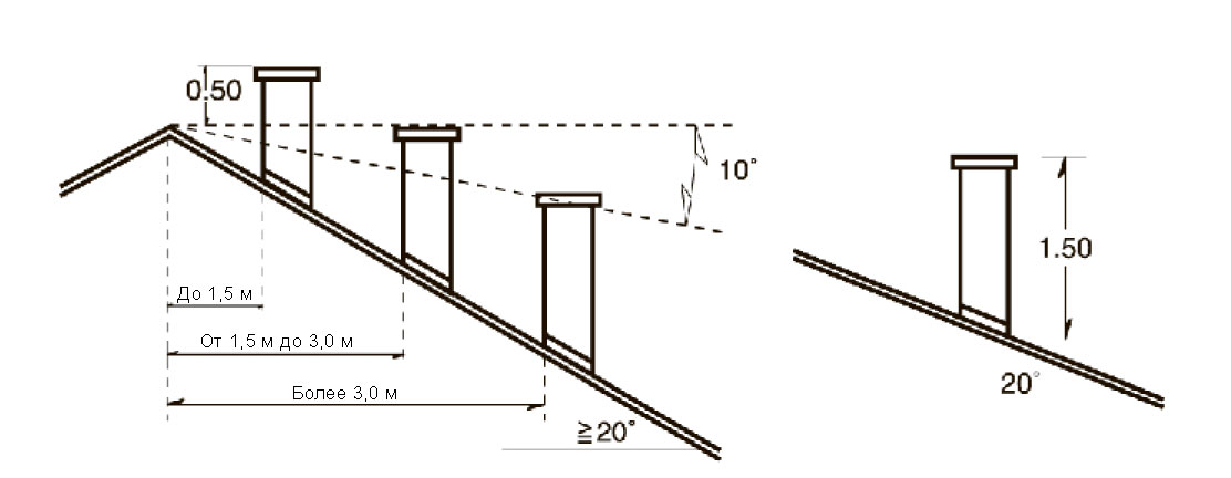 - Если дистанция между двумя объектами находится в диапазоне 1,5-3 м, дымовая шахта должна быть не ниже уровня конька.