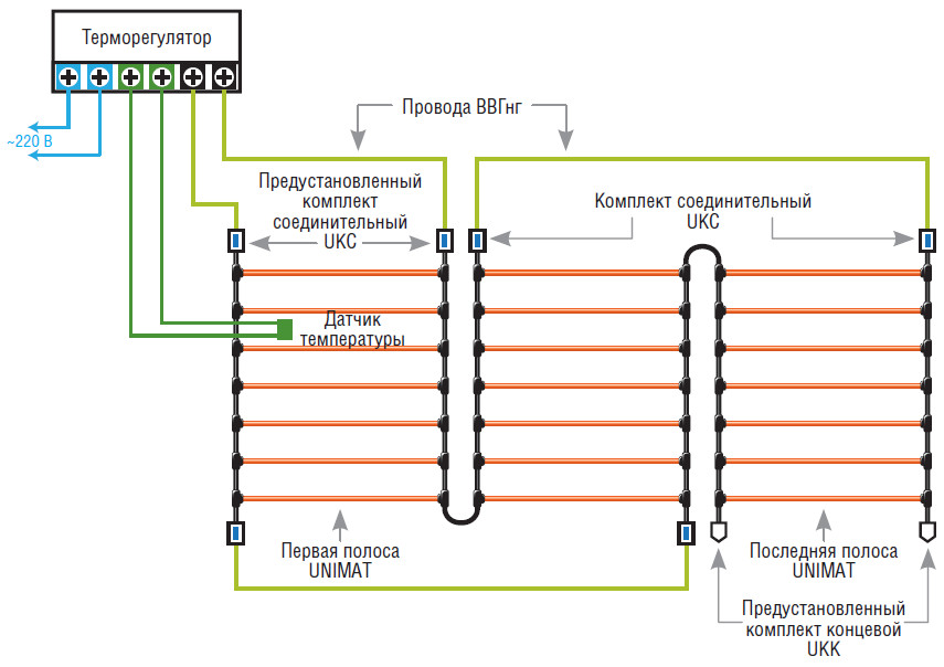 А если одножильный нагревательный мат, имеющий два холодных конца с каждой стороны, то здесь уже оба этих конца надо подводить и подключать к терморегулятору.
