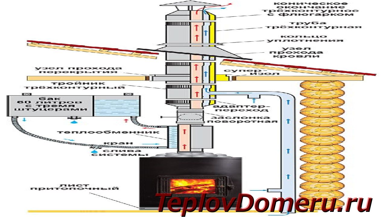 - Из печи должен выходить металлический патрубок без теплоизолятора. Его длина должна составлять больше одного метра, так как на выходе слишком большая температура. Выше можно воспользоваться сэндвичем.