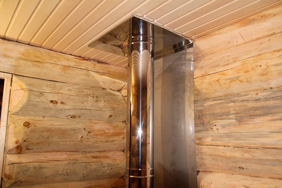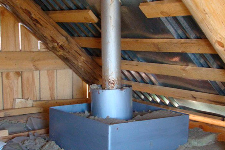 Проход круглой трубы дымохода через деревянный потолок при помощи ППУ разной конструкции