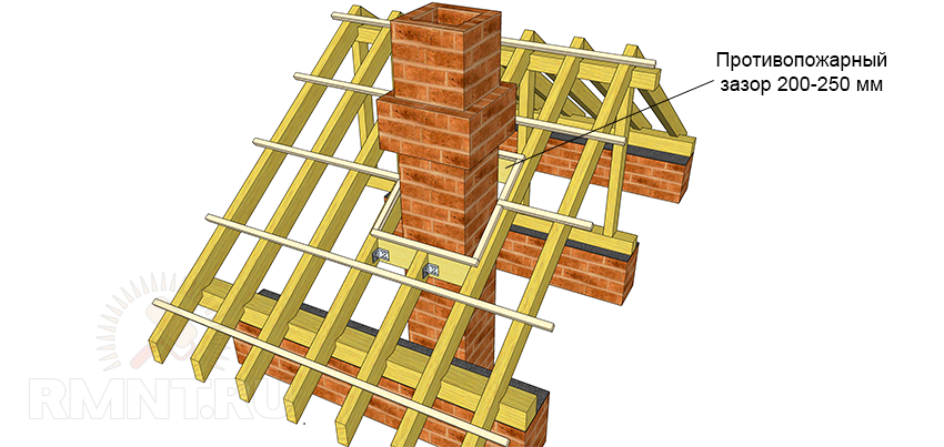 Устройство кровли состоит из слоев нескольких материалов, огнеупорные качества которых выражены по-разному. Тогда как большинство кровельным материалов не горят и не поддерживают горение, стропильная система, традиционно изготовляемая из древесины, не обладает такими свойствами. Для того, чтобы безопасно вывести дымоходную трубу через любой материал, монтируют проходной короб: