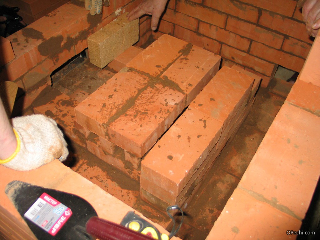 Новый кирпич окунаем в воду, после чего обильно обмазываем глиняным раствором по всем сторонам. Укладываем его в кирпичную кладку и подогреваем печь, чтобы раствор застыл. Используют тот же раствор, что и для замазывания щелей.