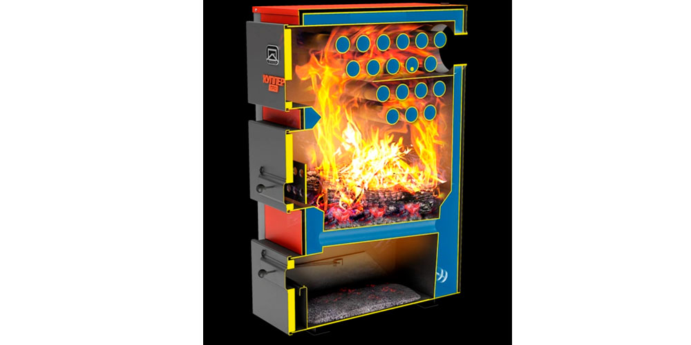 Дрова укладываются во всю высоту, поджигаются снизу, где происходит процесс горения, а факел пламени направляется в другой отдел, соединенный в нижней части с основным котлом.