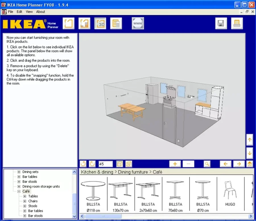 IKEA Home Planner представляет собой упрощенную разновидность системы трехмерного проектирования помещений. Работать с ней может любой пользователь, даже не обладающий навыками архитектора или инженера. В первую очередь программа предлагает создать план комнаты, указав ее размеры, расположение окон, дверей, коммуникаций. На втором этапе можно приступить к размещению мебели. Все модели хранятся в специальной библиотеке IKEA Home Planner. Наличие 3D-режима позволяет быстро трансформировать чертеж в полноценный трехмерный объект. Проект помещения по окончании работы можно сохранить в формате FPF или BMP, а после распечатать. Также присутствует облачное хранилище, с помощью которого можно предоставить общий доступ к проекту.