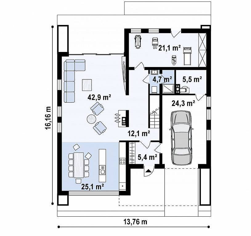 Дом со вторым этажом мансардного типа, построенный в стиле шале. Планировка просторного первого этажа полностью отдана под так называемые нежилые помещения и гостиную, площадью 26,78 м2. На входе гостей встречает небольшая прихожая с дверью в кладовую, чуть дальше санузел и рабочий кабинет главы семейства. В отсутствии необходимости такого помещения допускается перепланировка под другие цели, например, детская игровая комната, просторная гардеробная или что-то иное.