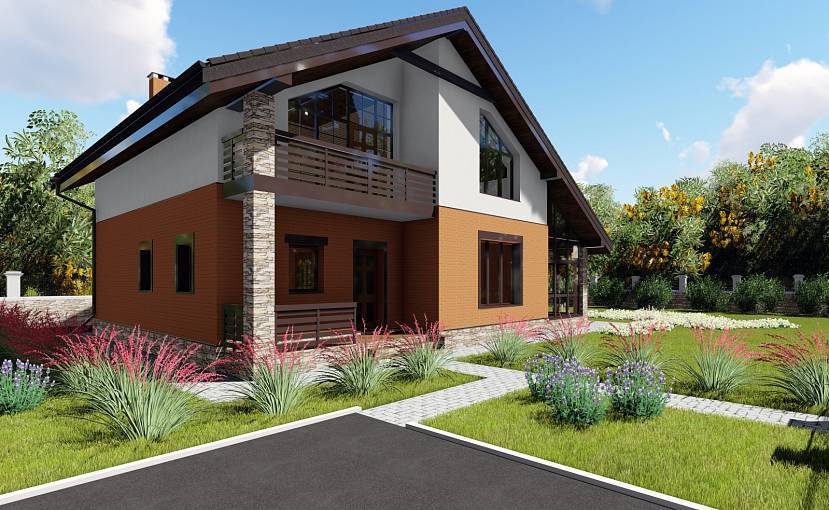 Проект двухэтажного коттеджа 8х8 с террасой и балконом
