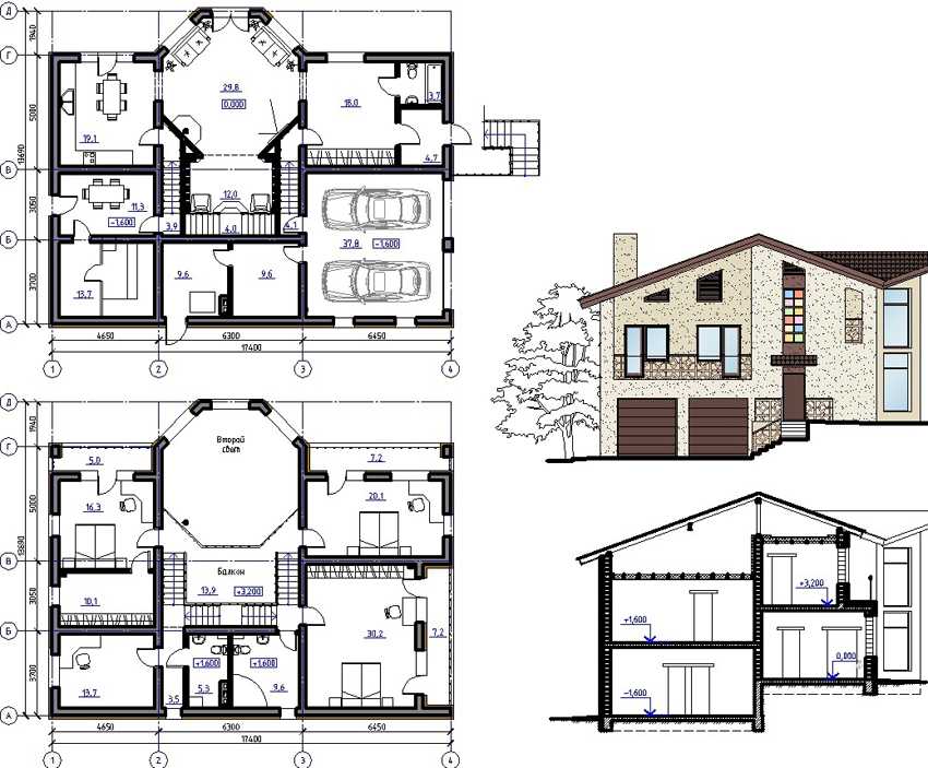Классический вариант проекта с чертежами двухэтажного дома включает такие разделы: