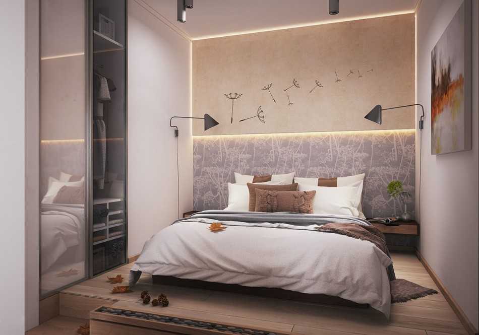 В проблеме с хранением книг и нужных подручных предметов выручат навесные полки над изголовьем кровати. Для искусственного создания простора специалисты рекомендуют использовать светлые оттенки в отделочных материалах и зеркальные вставки в мебели и декоре. Немаловажен свет, особенно естественный, поэтому не обременяйте окна плотным текстилем или жалюзи. Зрительно дышаться в квартире будет проще при выдержанном минимализме вещей и их способности к трансформации (складная или выдвижная кровать, консольный стол и т.д.).