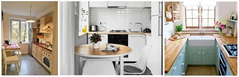 Главный принцип обустройства маленькой кухни – небольшие габариты предметов интерьера, это не помешает им выполнять свои функции. Не следует выбирать объемные украшения, изогнутые спинки стульев. Простые линии, отсутствие сложных орнаментов позволит визуально расширить пространство. Вместо стульев лучше выбрать легкие табуретки.