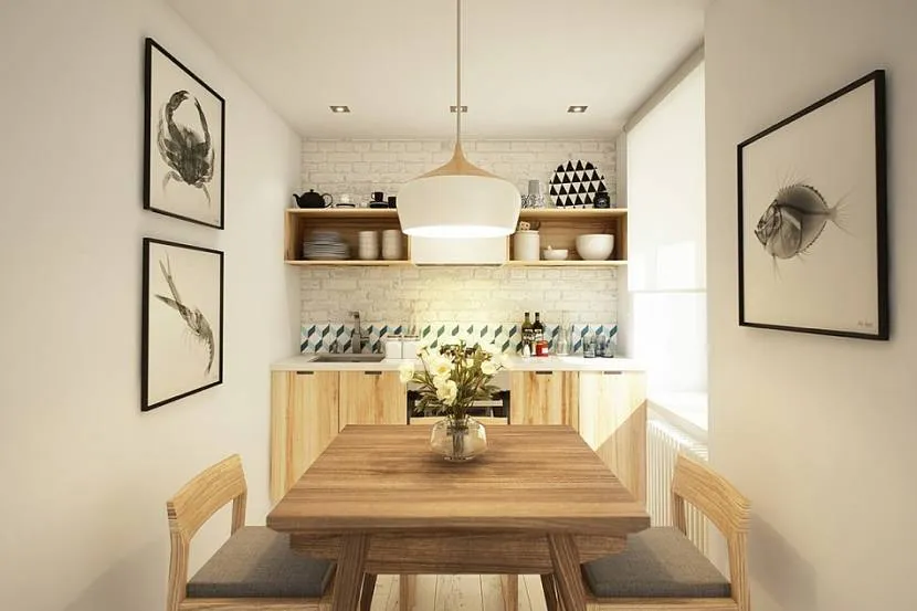 Отличным вариантом будет расставить мебель так, чтобы задействовать подоконник. Его можно расширить и превратить в столешницу, расположить под ним рабочую зону с мойкой. Правда, для этого придется привлекать специалистов для переноса коммуникаций. Стол со стульями размещают вдоль свободной стены.