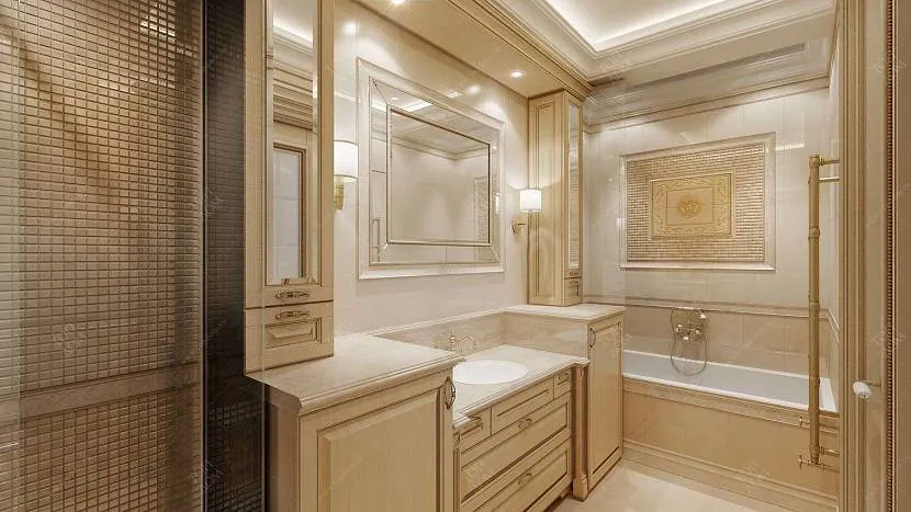 Представленный классический дизайн оформлен в характерных для стиля золотых оттенках, стену возле ванной украшает панно из плитки.
