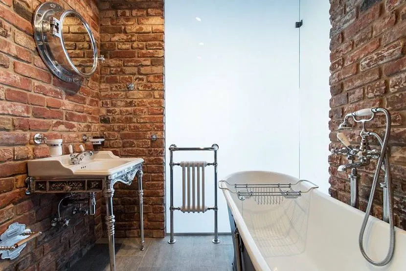 Современный дизайн ванной комнаты 6 кв. м. в стиле лофт создают с привлечением характерных для стиля материалов. Для оформления стен может быть использована красная кирпичная кладка. Для декорирования санузла в представленном варианте использовали кованые ножки стола, металлическое обрамление зеркала, оригинальные смеситель и краны. Эти детали помогли подчеркнуть уникальность стилистического направления.